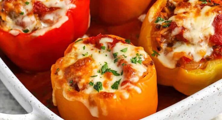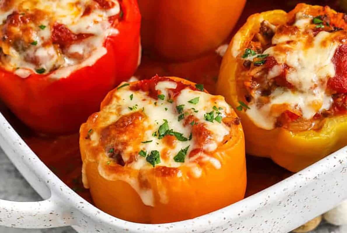Stuffed bell peppers are filled with a savory mix of beef, sausage, rice, and marinara. They’re baked with cheese until tender for a classic, cozy meal.